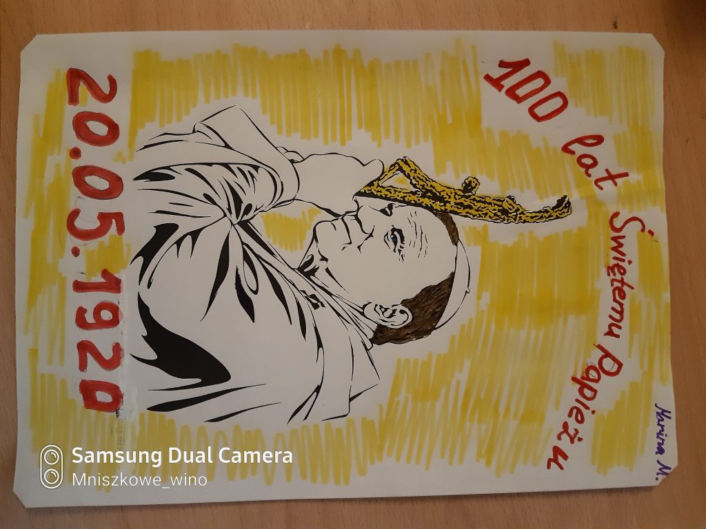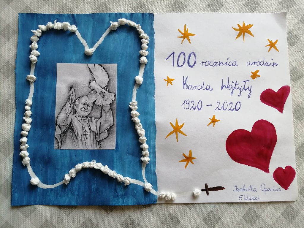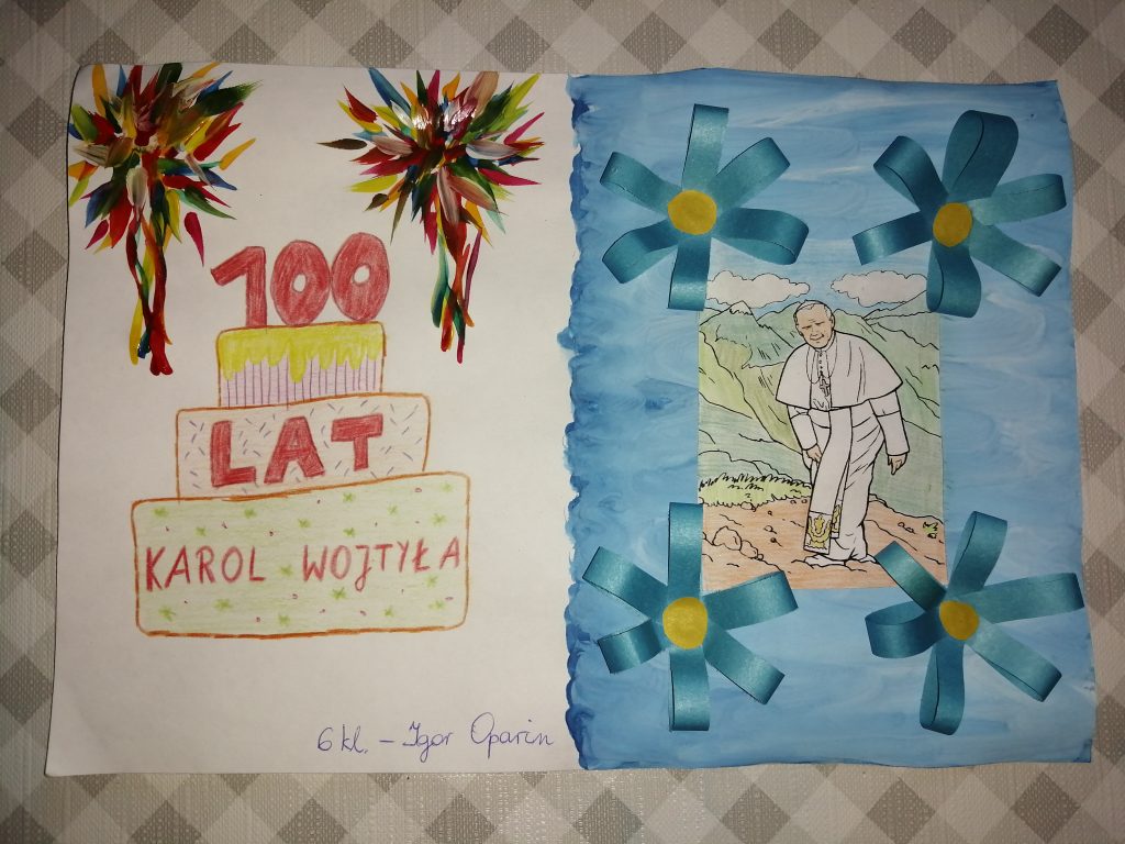 Miło nam poinformować, że uczniowie Szkoły Polskiej przy Ambasadzie RP w Moskwie pamiętają o 100 rocznicy urodzin Jana Pawła II. Z tej pięknej okazji przygotowali prace plastyczne dedykowane Wielkiemu Polakowi – św. Janowi Pawłowi II. Najpiękniejsze prace, w kolejności losowej zamieściliśmy poniżej . Autorom wyróżnionych prac gratulujemy!
